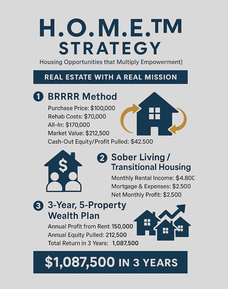 THE H.O.M.E.™ STRATEGY Housing Opportunities that Multiply Empowerment REAL ESTATE WITH A REAL MISSION This isn’t just another real estate guide—it’s a blueprint for generational wealth, community impact, and personal transformation. The H.O.M.E.™ Strategy fuses real estate investing with purpose-driven living, using the proven BRRRR method (Buy, Rehab, Rent, Refinance, Repeat) alongside transitional housing models and long-term reinvestment tactics. Whether you're starting with limited resources or looking to scale your portfolio, this strategy equips you with a clear, step-by-step system to: Leverage undervalued properties to create steady income Build equity while serving vulnerable communities Reinvest smartly to accelerate financial growth Turn five houses into a million-dollar legacy Designed to be applied in real life—not just theory—this guide teaches you how to create profitable, ethical housing while building freedom for yourself and others. If followed with discipline and vision, The H.O.M.E.™ Strategy can be the key that unlocks your path to wealth, empowerment, and lasting impact
